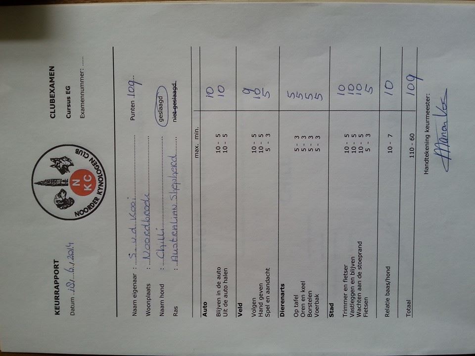 Talisman Queen of the Day "Chilli" passed her second test and got a diploma! The test consists out of different situations (at the vet and in the car) and an obedience part.